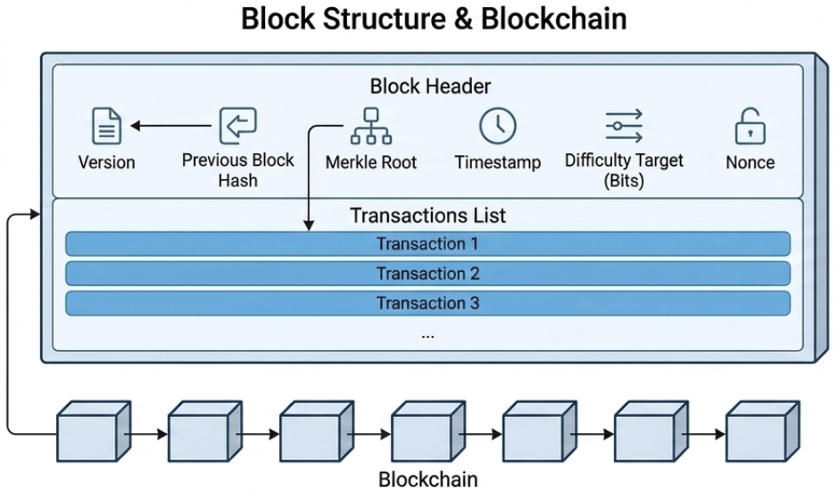 구체적인 방식은 다음과 같다. 일정 시간 동안 발생한 여러 거래(Transaction)를 모은다. 이 거래들을 하나의 해시값으로 요약한다. 이 해시는 거래 묶음의 지문(fingerprint) 역할을 한다. 그 다음 거래 해시 + 생성 시각(timestamp) + 기타 메타 정보들을 하나의 블록(Block) 으로 만든다. 새 블록은 이전 블록의 해시를 포함한다.