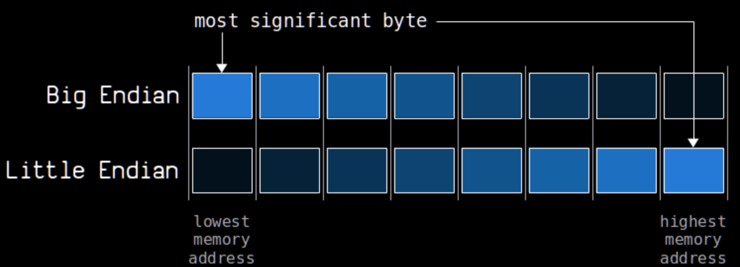 - 가장 큰 자리수(MSB, Most Significant Byte)를 가장 낮은 메모리 주소에 저장한다.