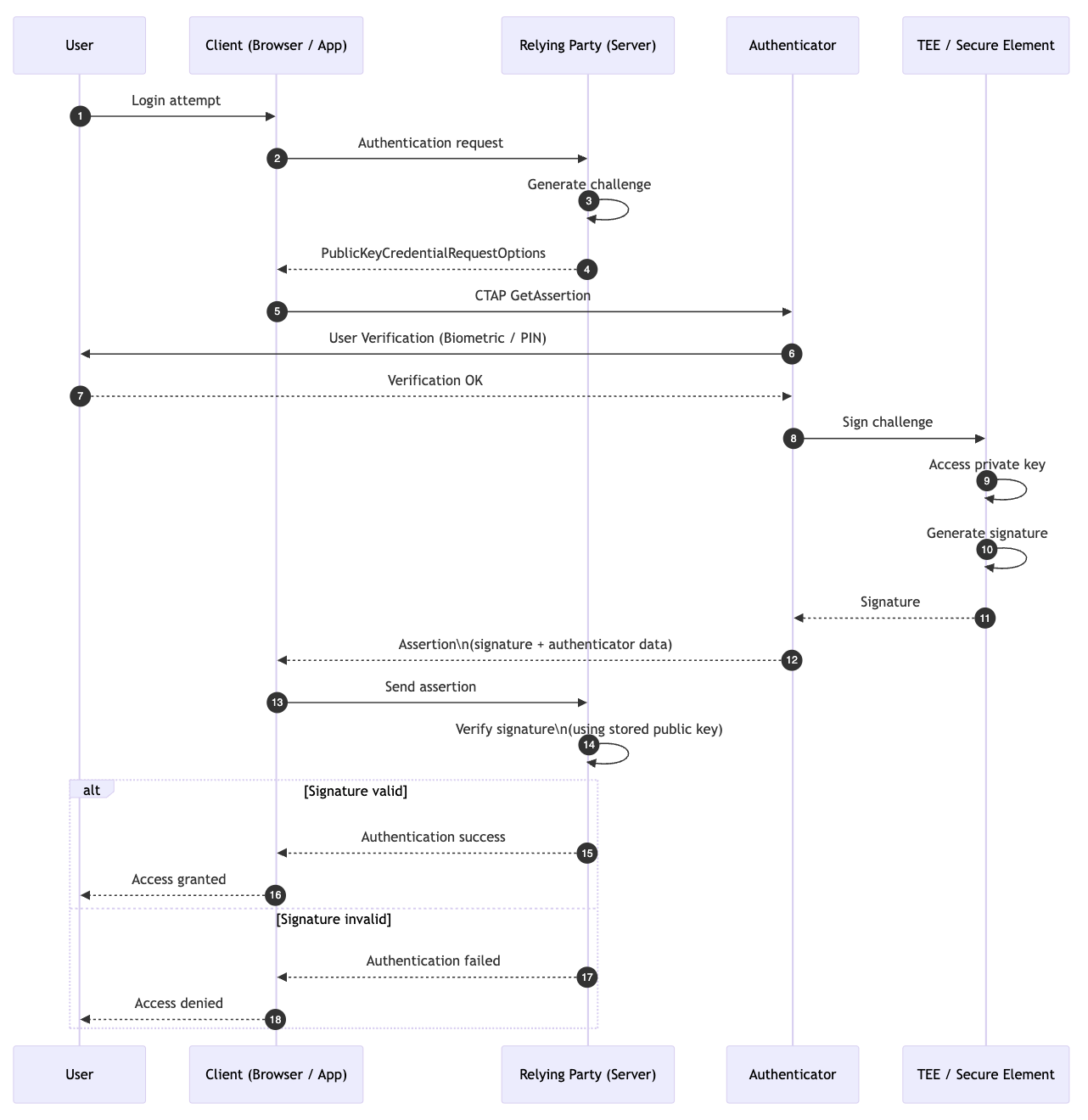 - 사용자는 생체 인식이나 PIN 입력으로 본인임을 인증하여 도전 과제에 응답한다.