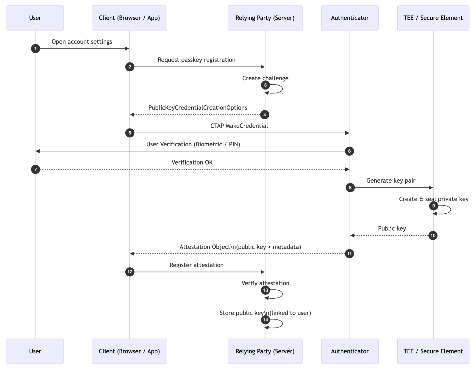 CTAP MakeCredential(Passkey 생성 명령) 은 "이 Relying Party 를 위해 사용할 새로운 공개키/개인키 쌍을 만들어라" 라고 요청하는 명령이다.