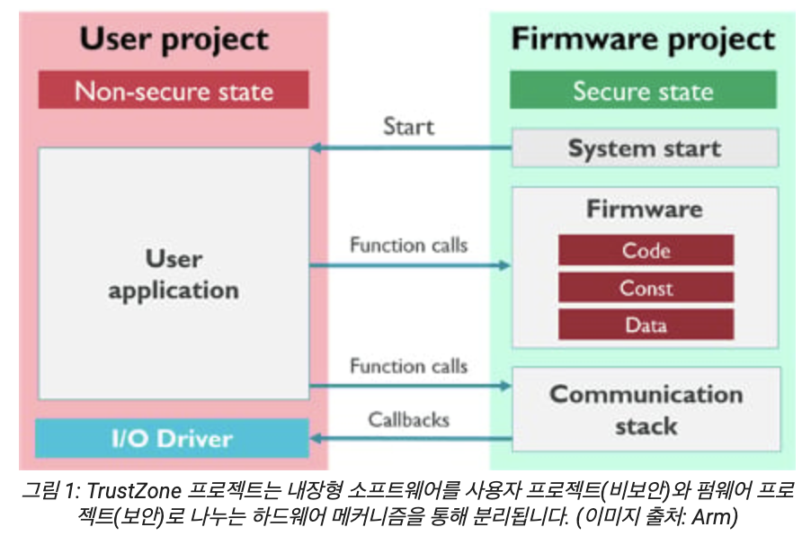 TrustZone 은 ARM 에서 개발한 ARMv6 이상의 CPU 에서 추가된 보안 확장 집합을 의미한다. CPU, 주소 공간, 메모리를 하드웨어 단위로 분리하여 기밀성과 무결성을 제공할 수 있는 보안 및 비 보안으로 격리된 환경을 제공하는 것이 핵심이다.