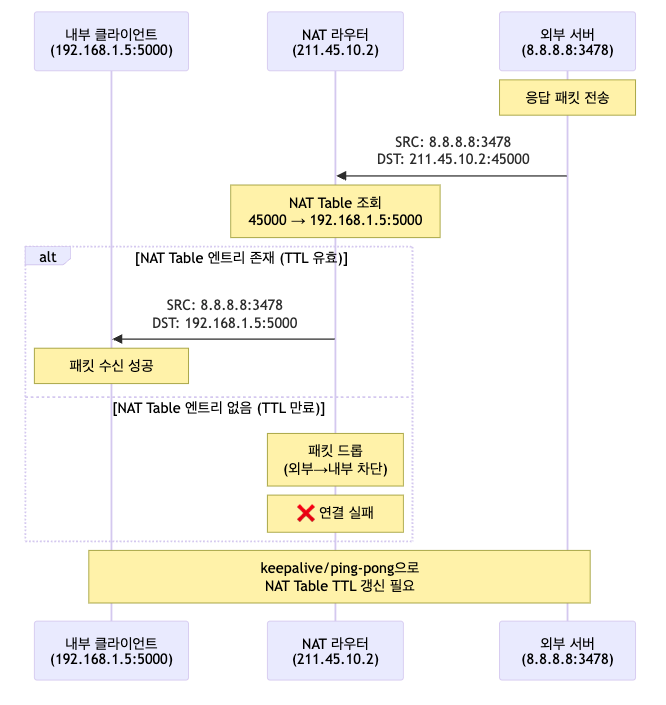 - TTL 관리: NAT Table의 TTL이 만료되면 Inbound 패킷이 차단되므로 keepalive가 필요함