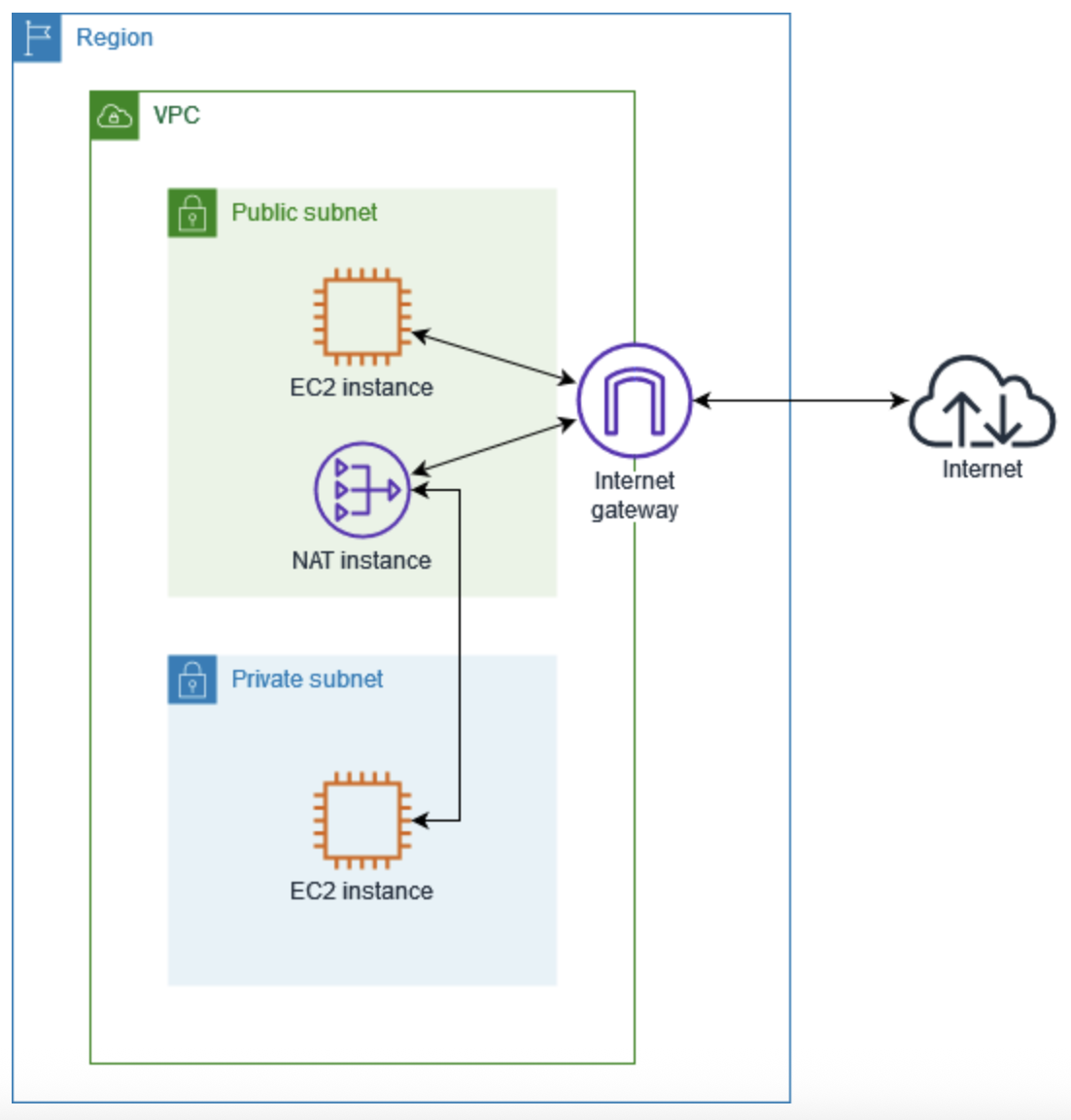 NAT 인스턴스는 인터넷에 액세스할 수 있어야 하므로, 퍼블릭 서브넷(인터넷 게이트웨이로 가는 경로가 있는 라우팅 테이블이 있는 서브넷)에 있어야 하며, NAT 인스턴스에는 퍼블릭 IP 주소 또는 탄력적 IP 주소가 있어야 한다.