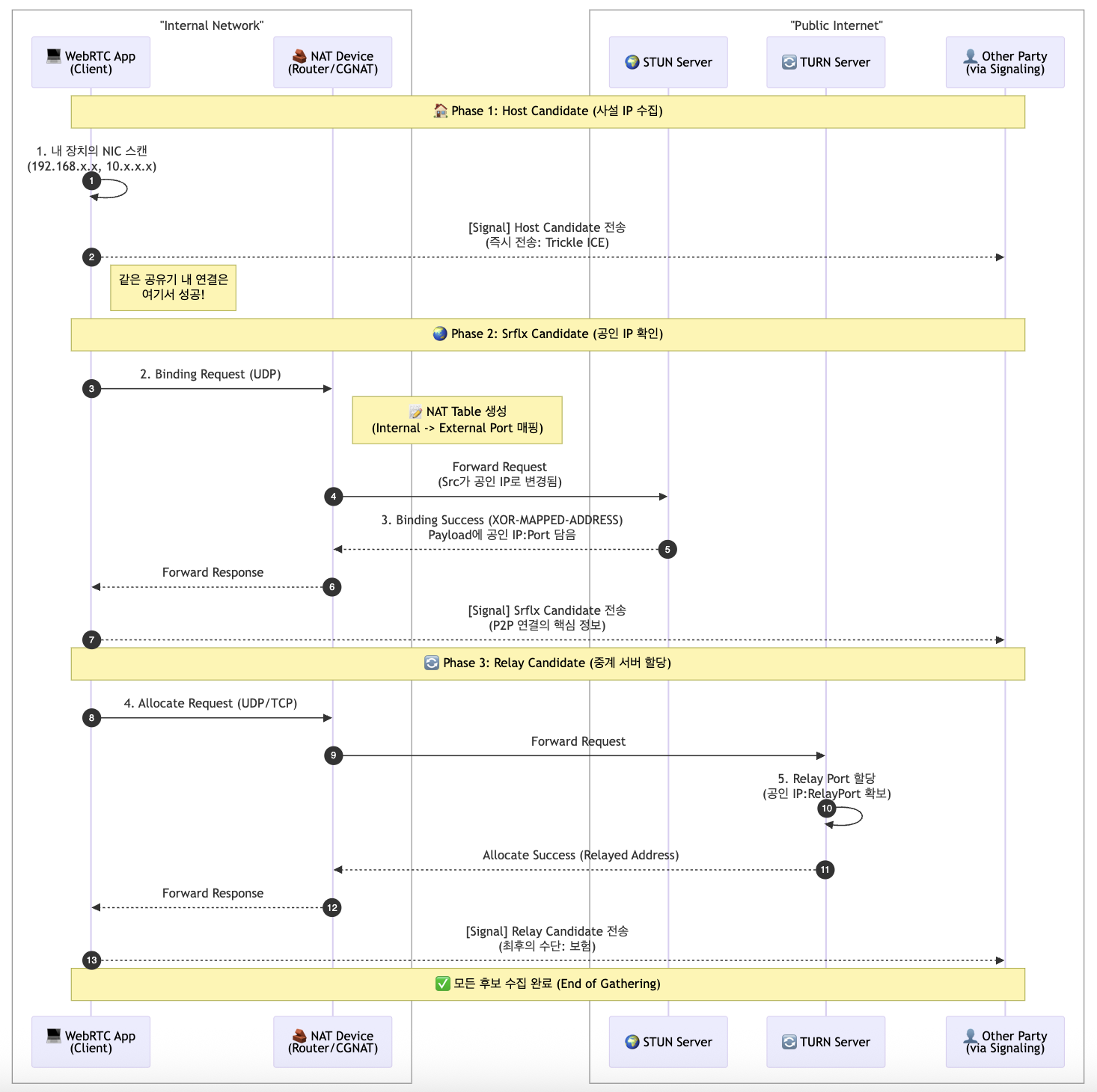 이 다이어그램은 애플리케이션이 NAT 를 거쳐 STUN/TURN 서버와 통신하고, 확보된 주소(Candidate)를 상대방(Peer) 에게 시그널링하는 전체 과정을 설명한다.