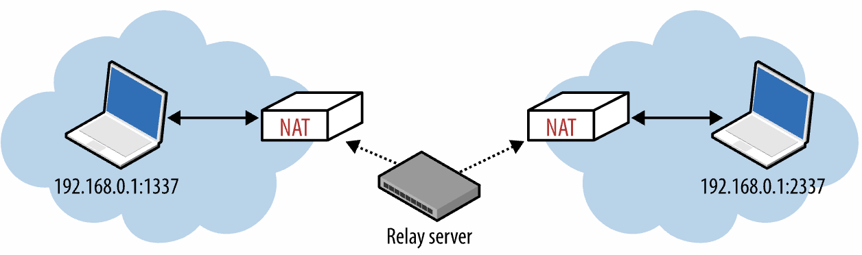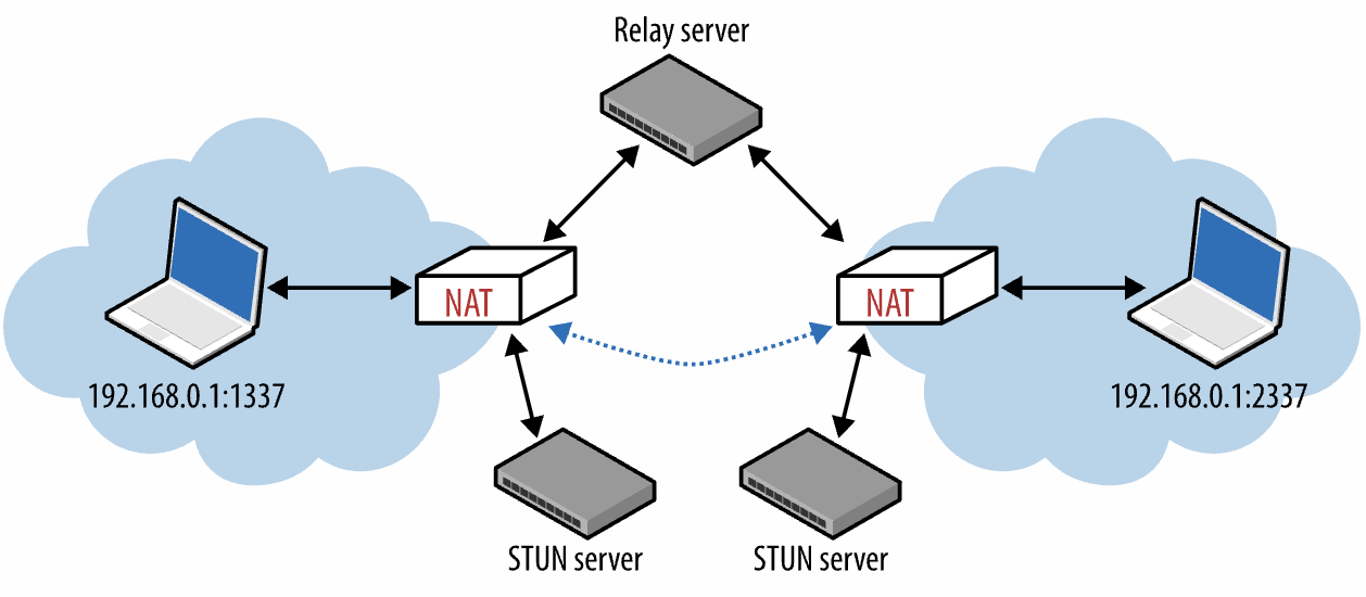 TURN(Traversal Using Relays around NAT) 프로토콜은 모든 것이 실패했을 때 UDP 를 버리고 TCP 로 전환하는 기능을 한다. TURN 프로토콜은 피어 간에 데이터를 왕복 운반하는 공용 중계(public relays)를 이용한다.