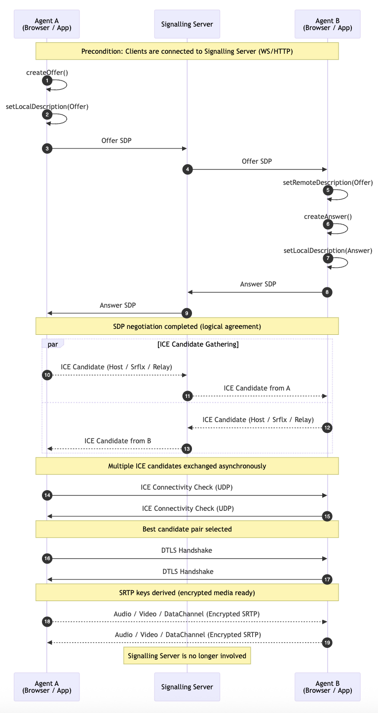 WebRTC 에이전트를 생성했을 때, 상대 피어에 대해 아는 것은 없다. 시그널링은 통화를 가능하게 만드는 초기 부트스트랩 단계다. 이 값들을 교환한 뒤에는 WebRTC 에이전트끼리 직접 통신할 수 있다.